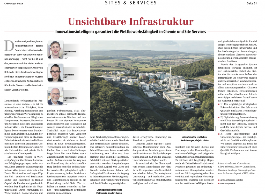 Die Begeisterung von Prof. Dr. Carsten Suntrop inspiriert das handverlesene CMC² Team aus hochkarätigen Netzwerkpartnern und Experten, das sich der Strategieberatung für die Chemie und Pharmazie verschrieben hat.