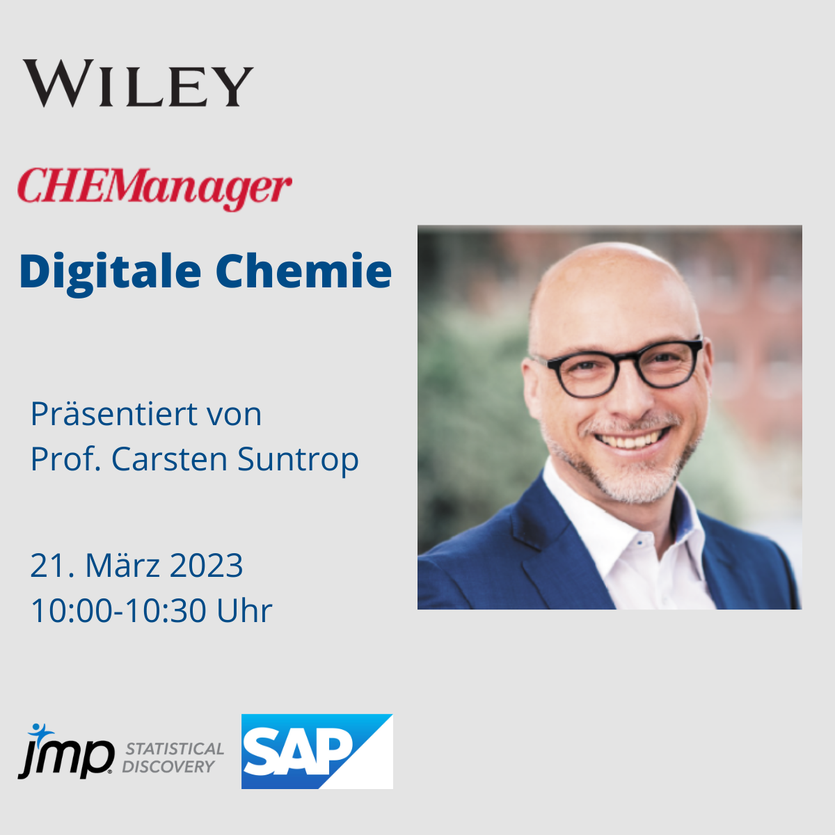 Am 21.03.2023 hat das Chemanager-Webinar „Digitalisierung in der Chemieindustrie“ stattgefunden und Prof. Dr. Carsten Suntrop hat einen Keynote zum Thema „Digitale Chemie“ gehalten und die Panel-Diskussion zum Thema „Zukünftiger Grad der Automatisierung chemischer Wertschöpfung“ moderiert.