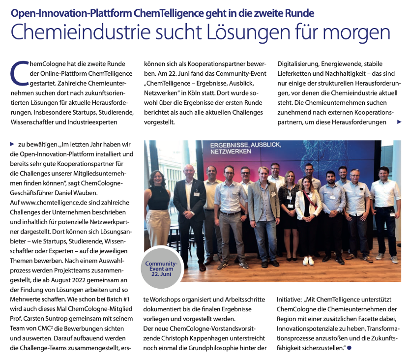 ChemCologne – das Branchennetzwerk der Chemieindustrie im Rheinland – hat die Online-Plattform ChemTelligence ins Leben gerufen, die wir als CMC² unterstützen und die nun in die zweite Runde startet!