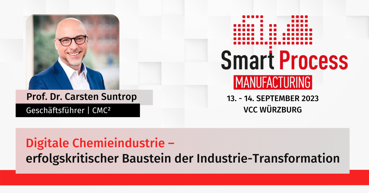 Treffen Sie Prof. Dr. Carsten Suntrop – den geschäftsführenden Gesellschafter von CMC² – vom 13. – 14. September 2023 in Würzburg beim Smart Process Manufacturing Kongress, dem Leitkongress für Digitalisierung in der Prozessindustrie.