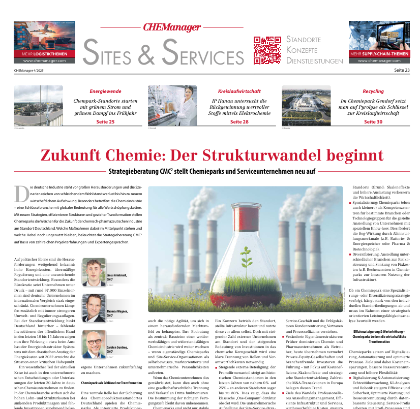 Als Experten für Chemiestandorte bieten wir Ihnen in diesem Bereich ebenfalls umfangreiche Leistungen an, wie beispielsweise die Entwicklung einer Standortstrategie, Erhöhung der Standortattraktivität oder das Durchführen eines Site Service Assessments.
